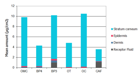 Using appropriate conditions, which are described in the OECD 428 guidelines, absorption of test compounds during a given time interval is measured by analyzing both receptor fluid and the treated skin.